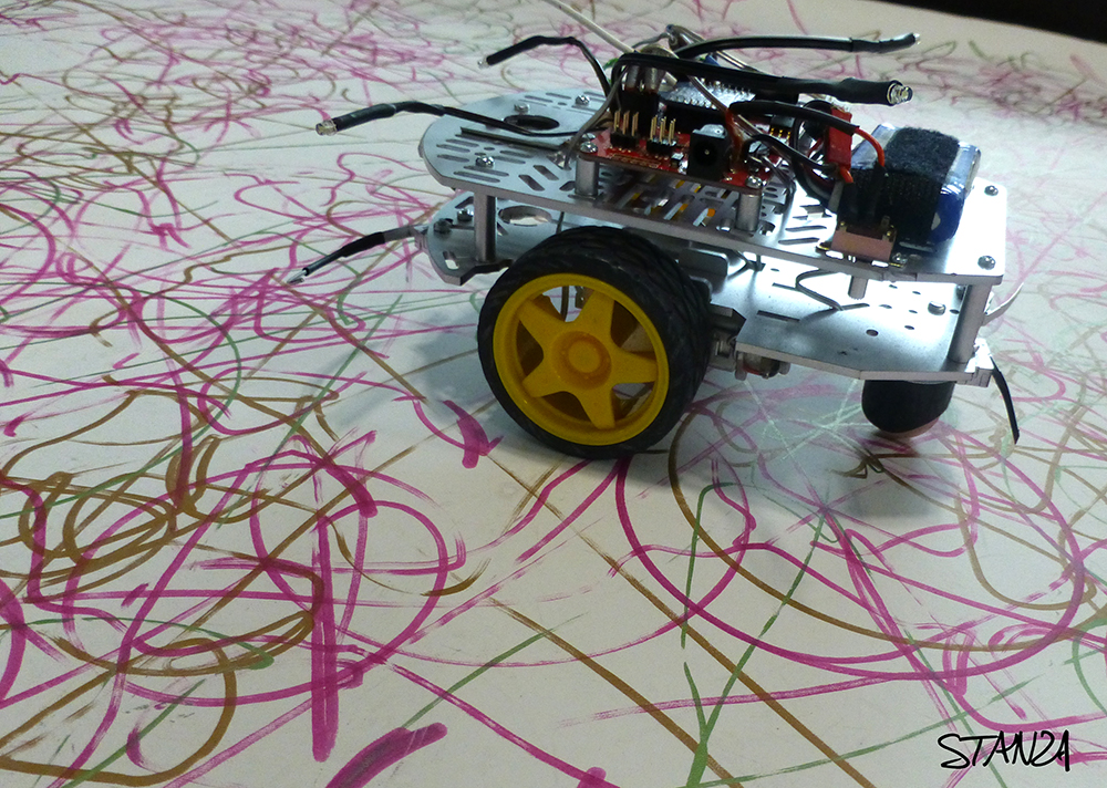 How it works. The Robot is controlled over an 868 Mhz serial data wireless link, from a custom app. written using Xojo. The app. hooks into the OSX speech recognition system to extract words as the user is reading the text. The words are analysed for alphabetical order and length, and these values are used as indexes into a command table. The command table stores the data that describes a robot movement, or set of movements. These are sent in real-time to the robot and it moves and draws patterns. If the robot encounters a wall it moves away a random amount, and then carries on executing the commands.
