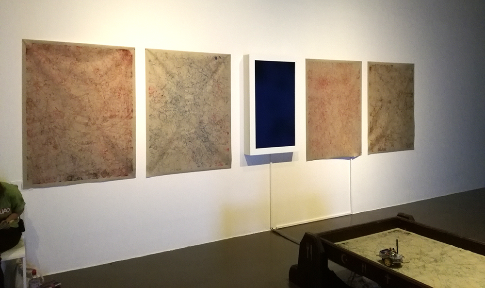 This work is available for touring and can be shown on various contexts. It now has two robots one is a spare for back up. . Canvases get hung on the gallery walls. A large screen also shows the system working in real time as a visualization, so you can see what the computer understands you to be saying. All equipment supplied except the screen.