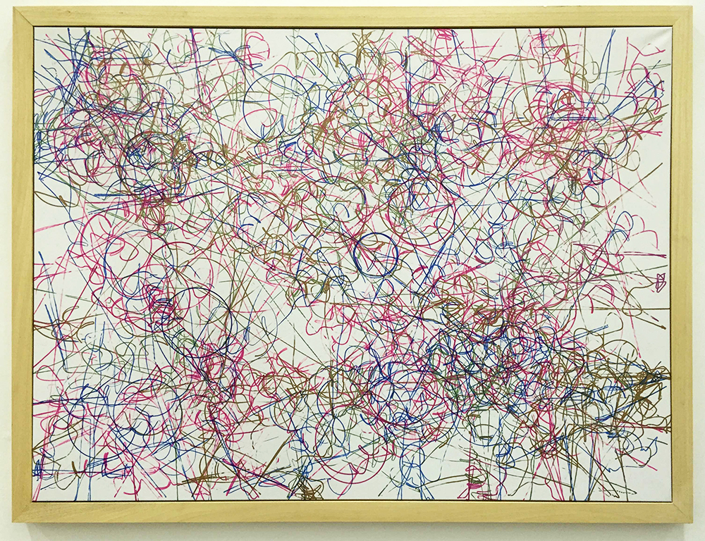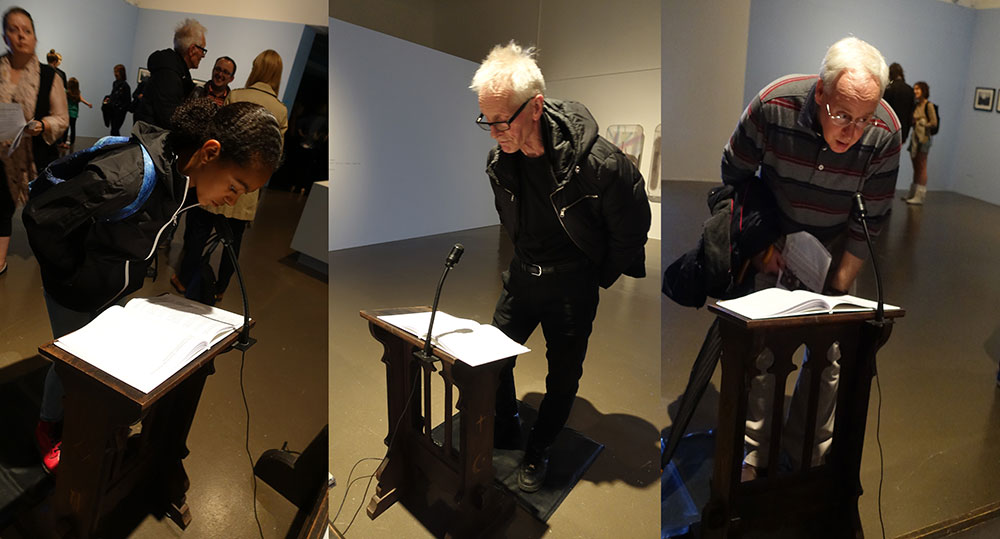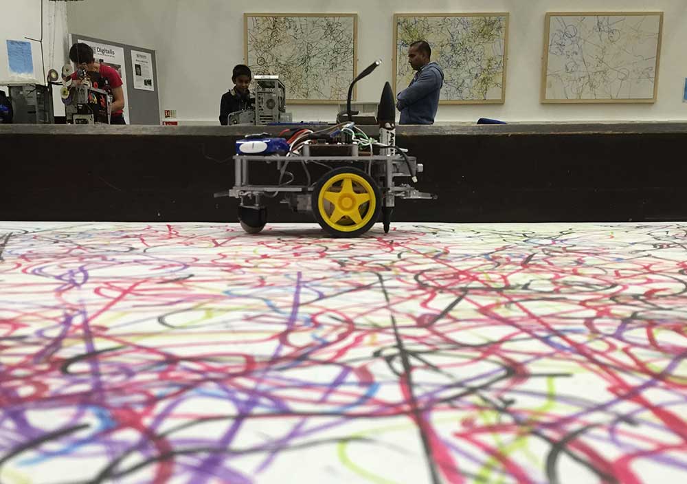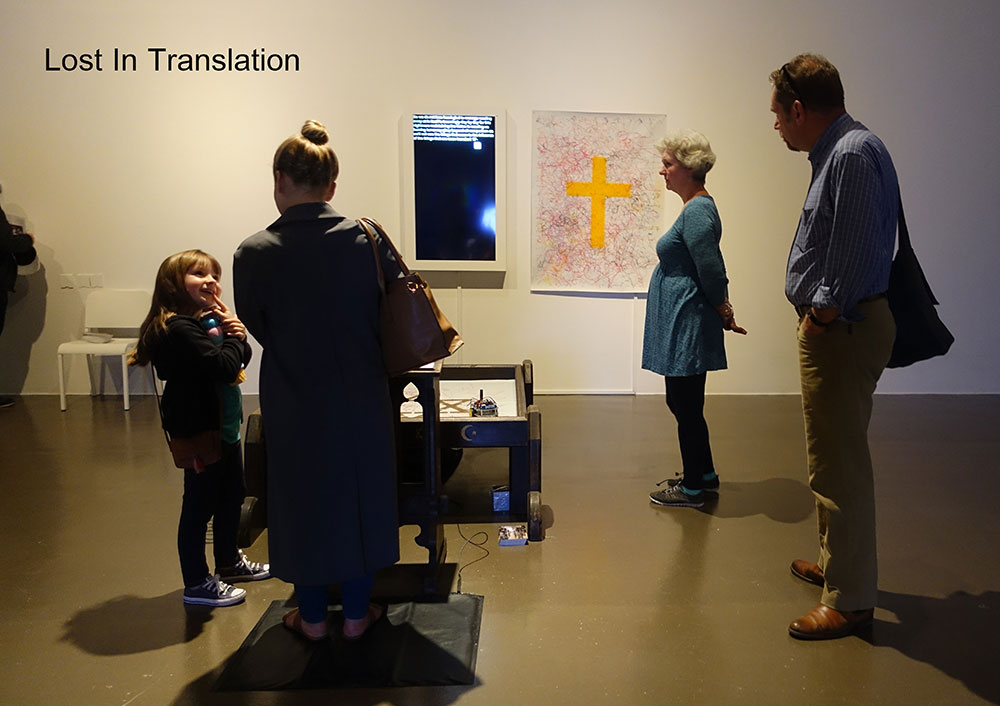 Installation. You read to a custom made robot that responds to a series of texts and makes drawings unique to each reader. Readers are invited to step up to the lectern and read into a microphone from a specially made book called Lost In Translation. The book consists of passages from The Bible, The Torah, The Quran and a Take Away menu. The text and voice are interpreted via software and a robot is set into action on a custom made plinth to interpret what it all means. The robot interprets the text and the voice to creates a painting on canvas of the results. The work questions not only the meaning and interpretation of text but just who controls our understanding of the outputs and indeed what is Lost In Translation. This is a very playful user friendly work and actively engages the audience not only to think about the text but the meaning of how automation and networked technology is changing the control of understanding. The artwork poses the question just who is in control of whom.