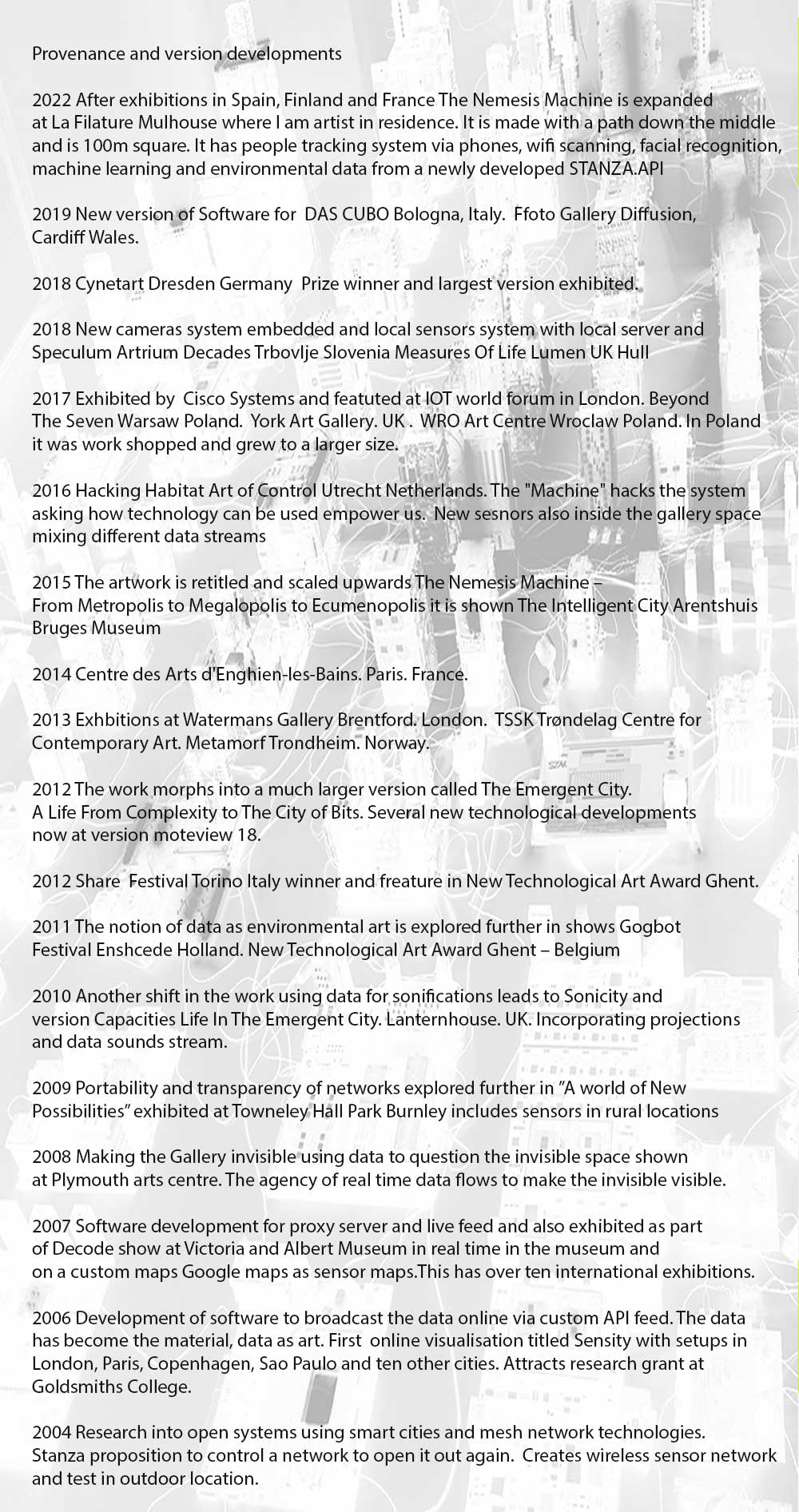 The title is in two parts: “The Nemesis Machine” with the additional “From Metropolis to Megalopolis to Ecumenopolis”. The installation has become an evolving artwork. Whilst growing in physical size, the technology is also developing to reflect changes in our relationship with the digitised world, new technology, and our algorithmic society.
