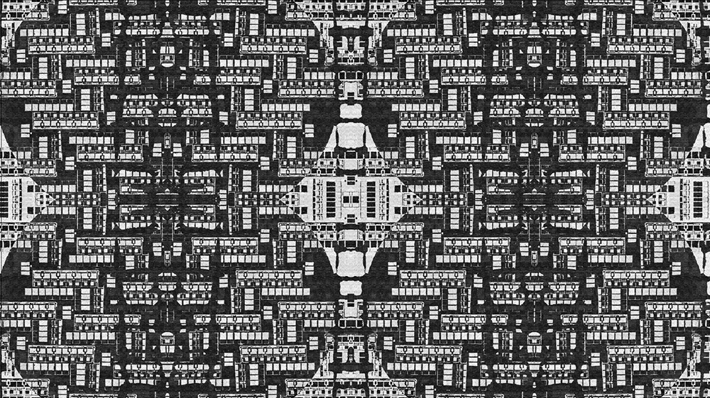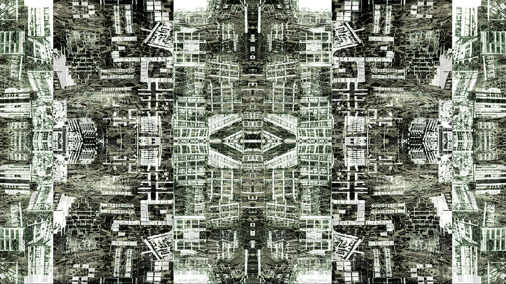 This artwork is derived from investigating the maps of London, Paris, and Chicago. Influenced by urban design going back to my work while at Goldsmiths College London in 1983 as a student. Overlayering maps creates a fused space alluding to new worlds and imaginary cities. These fictional places are hybridised identities of the landscape. The landscape of the map and of the city is reformed becuase of the marks we make. This generative software system is made from processed images of maps from around the world to create more fictional cities and imaginary cities. In this original artwork 'Palindromeda' can only be mirrored a the twinning process where is each half is actually part of the cellualar zygote. The cell formed by the union of two maps that mirrors in identity and spilts. In the mirror the sequence that reads the same backwards as forwards is created, the palindrome space. This mirror twinning is determined by the time it takes to split the original. By doing this and merging multiple cities a new space is created.