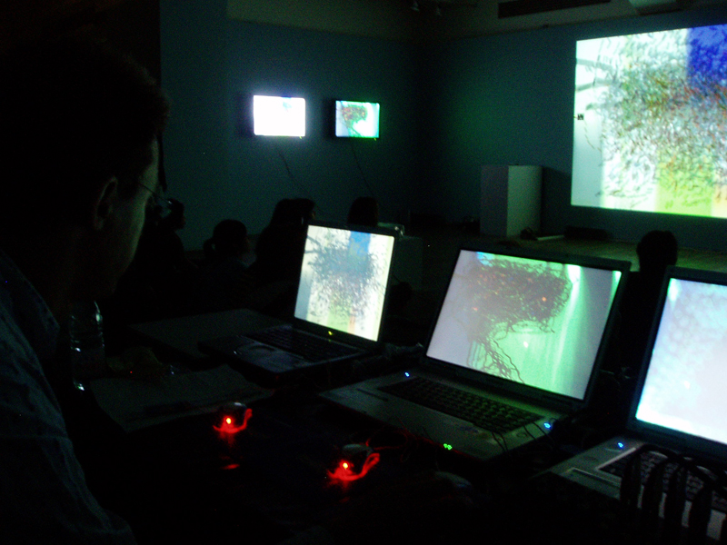 The digital generative custom coded software are projected to at least eight projectors connected to touch screens or latops . The sounds are generating and they are fed into custom made software. This is a more ambient and colourful performance. They are digital paintings exposed as a generative and ambient event. The performances can also use four custom made touch screens which enables the audienc to come up and interact in the performance.